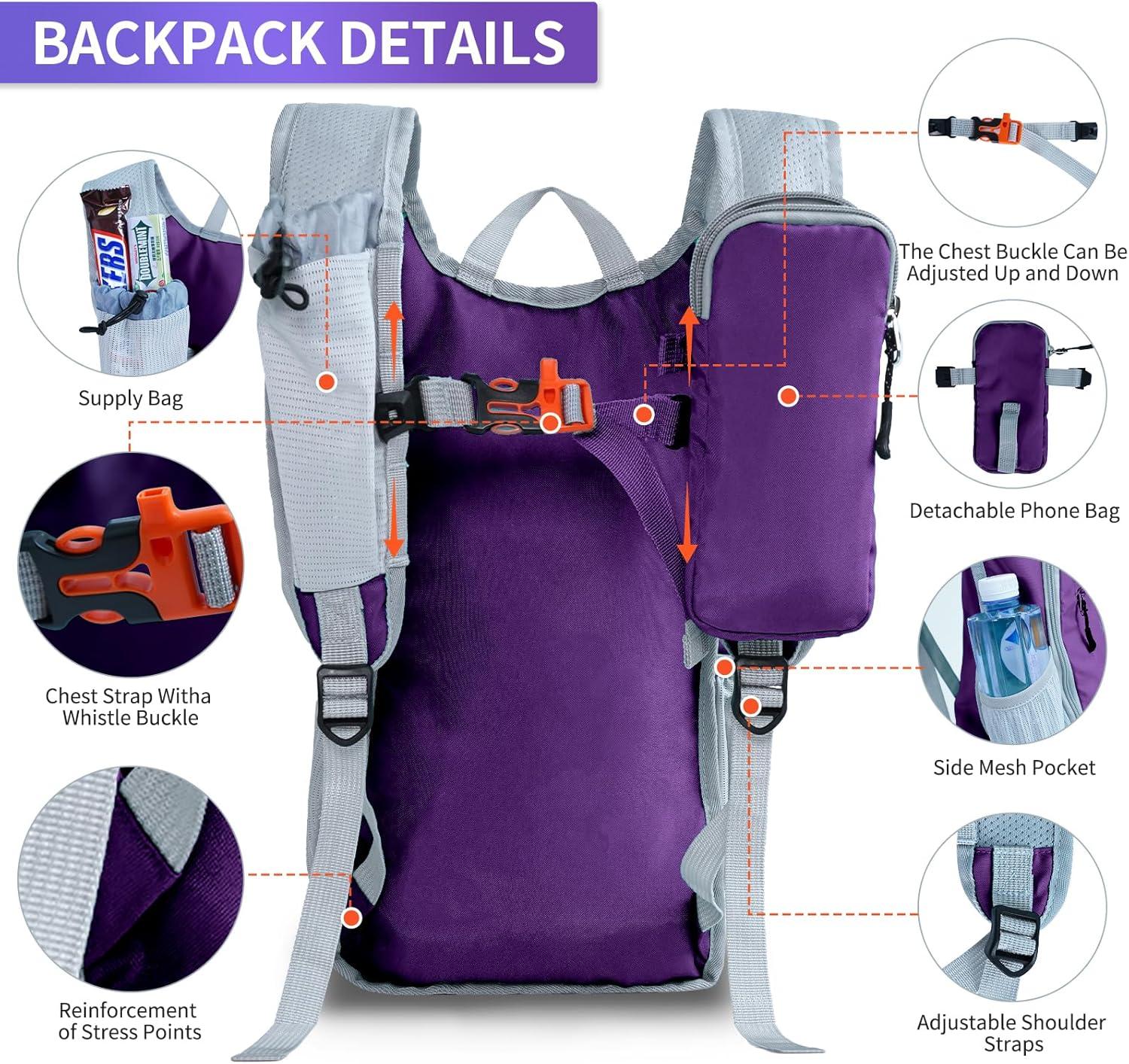 PORTABLE CELL PHONE BAG: the left shoulder strap of the hiking backpack for women is equipped with a cell phone bag with zipper, and it can be removed, it is enough to hold 1 7-inch cell phone, the right shoulder strap is equipped with an elastic bag with drawstring, which can hold snacks, water bottles and other hiking use, easy to take.