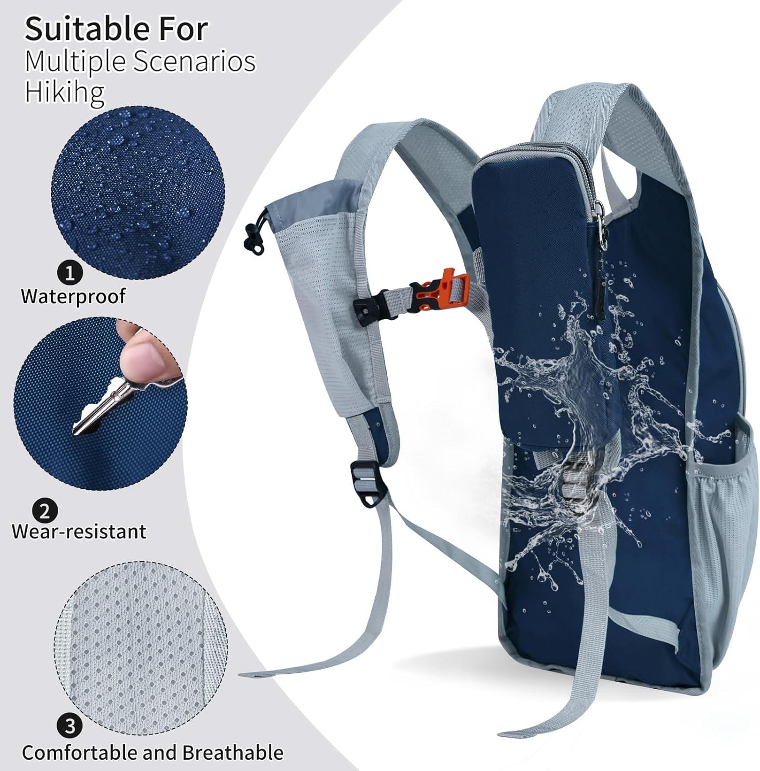 HIGH-QUALITY MATERIALS: the day hiking backpack is made of high-density polyester waterproof fabric and high-quality zippers, the shoulder strap is made of breathable fabric, reinforced at the stress point, durable and not easy to tear, outdoor hiking, even if it rains, it will not wet important items inside the Small hiking backpack.