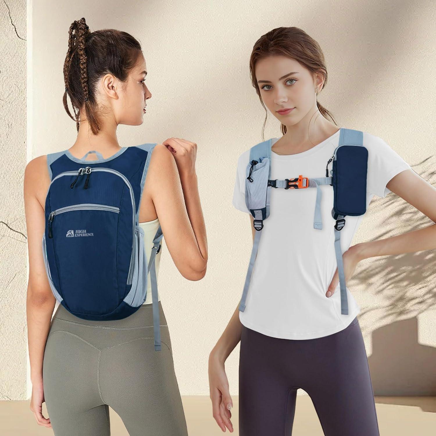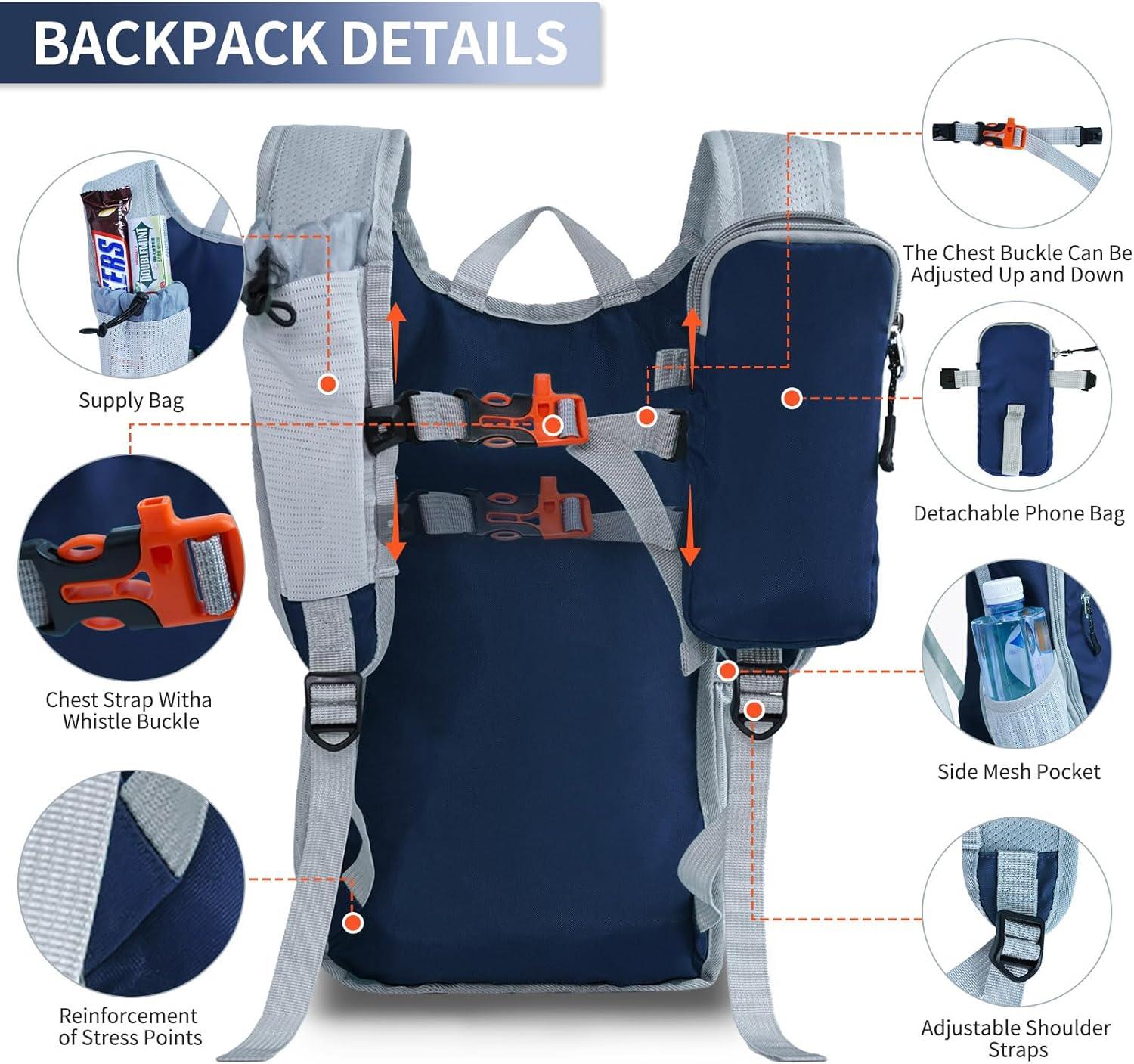 PORTABLE CELL PHONE BAG: the left shoulder strap of the hiking backpack for women is equipped with a cell phone bag with zipper, and it can be removed, it is enough to hold 1 7-inch cell phone, the right shoulder strap is equipped with an elastic bag with drawstring, which can hold snacks, water bottles and other hiking use, easy to take.