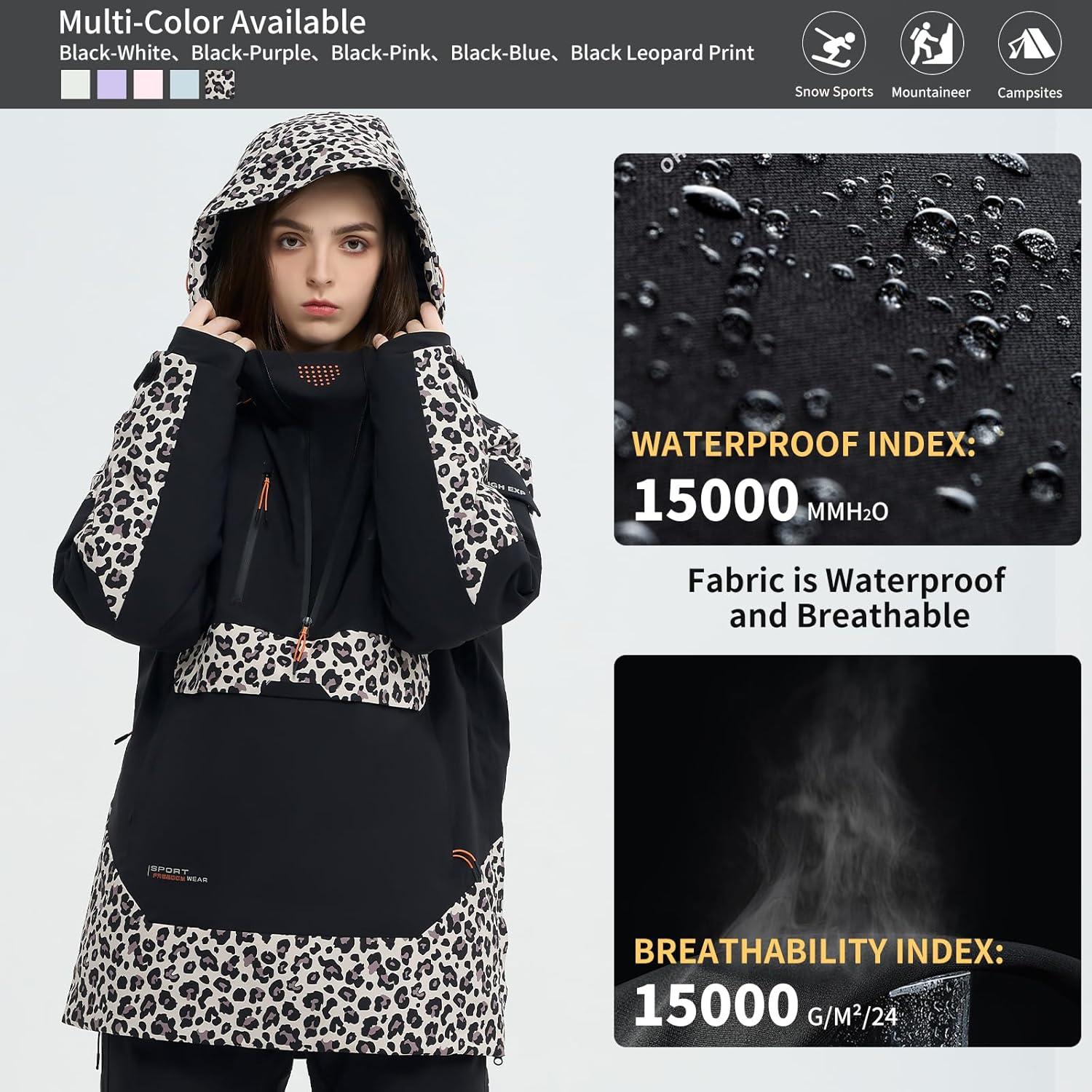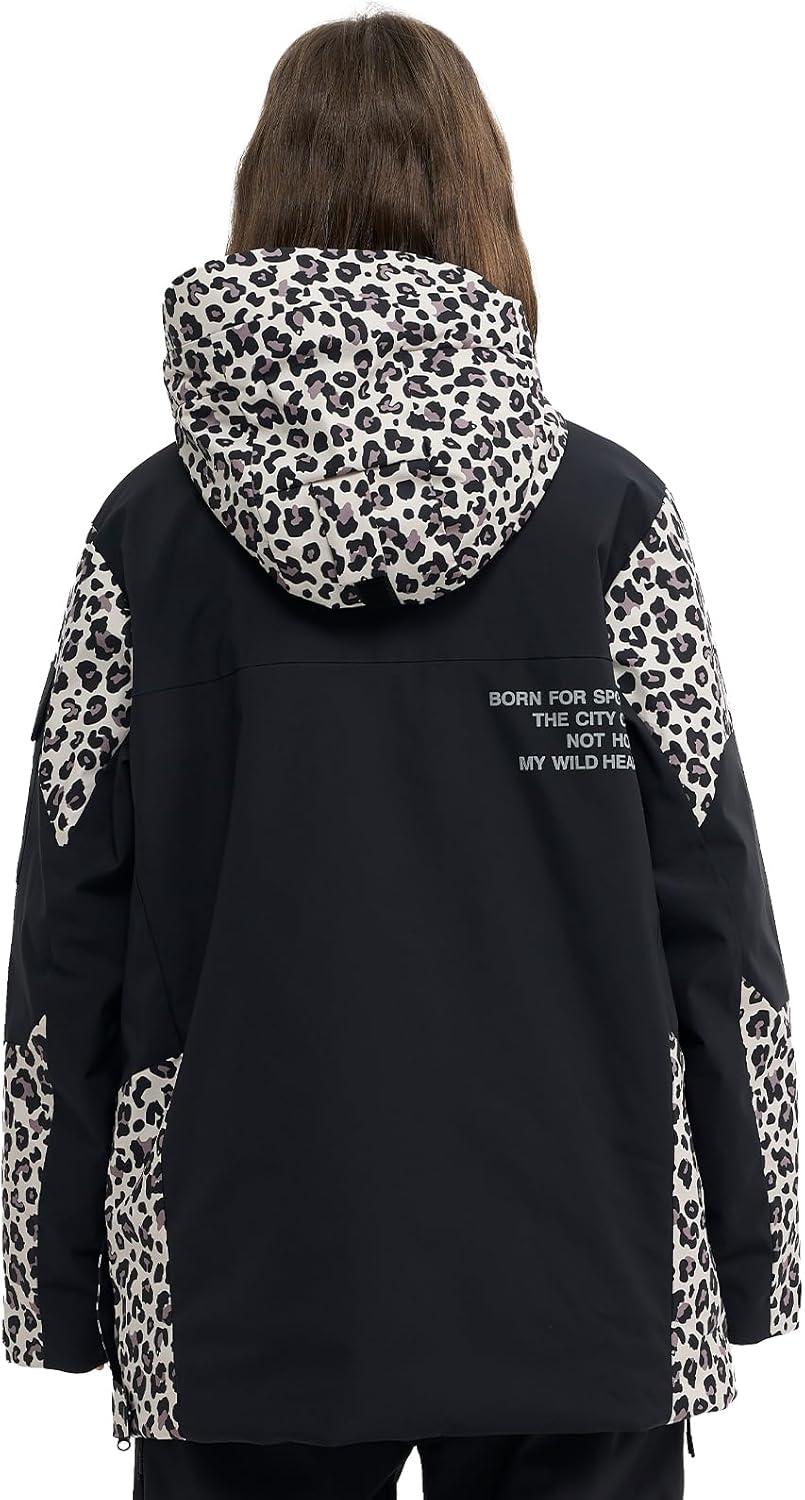 Ski Jacket Snowboard Anorak Coat Pullover Baggy Snow Hooded Insulated Hoodie Waterproof Warm for Women Men(Black Leopard Print)