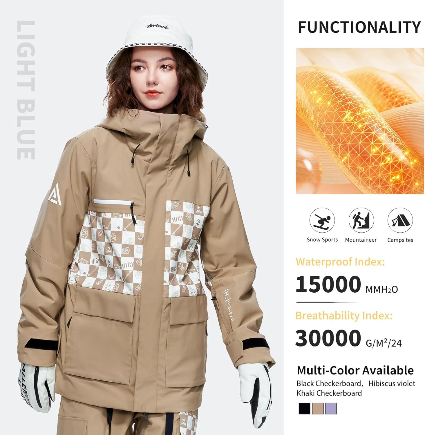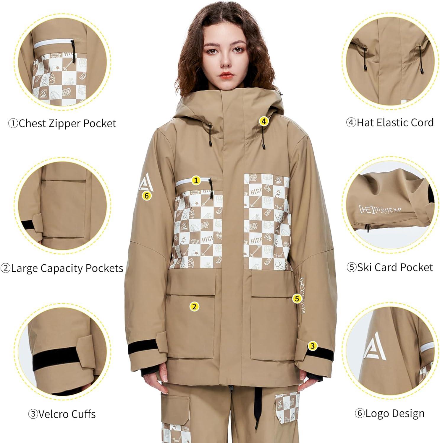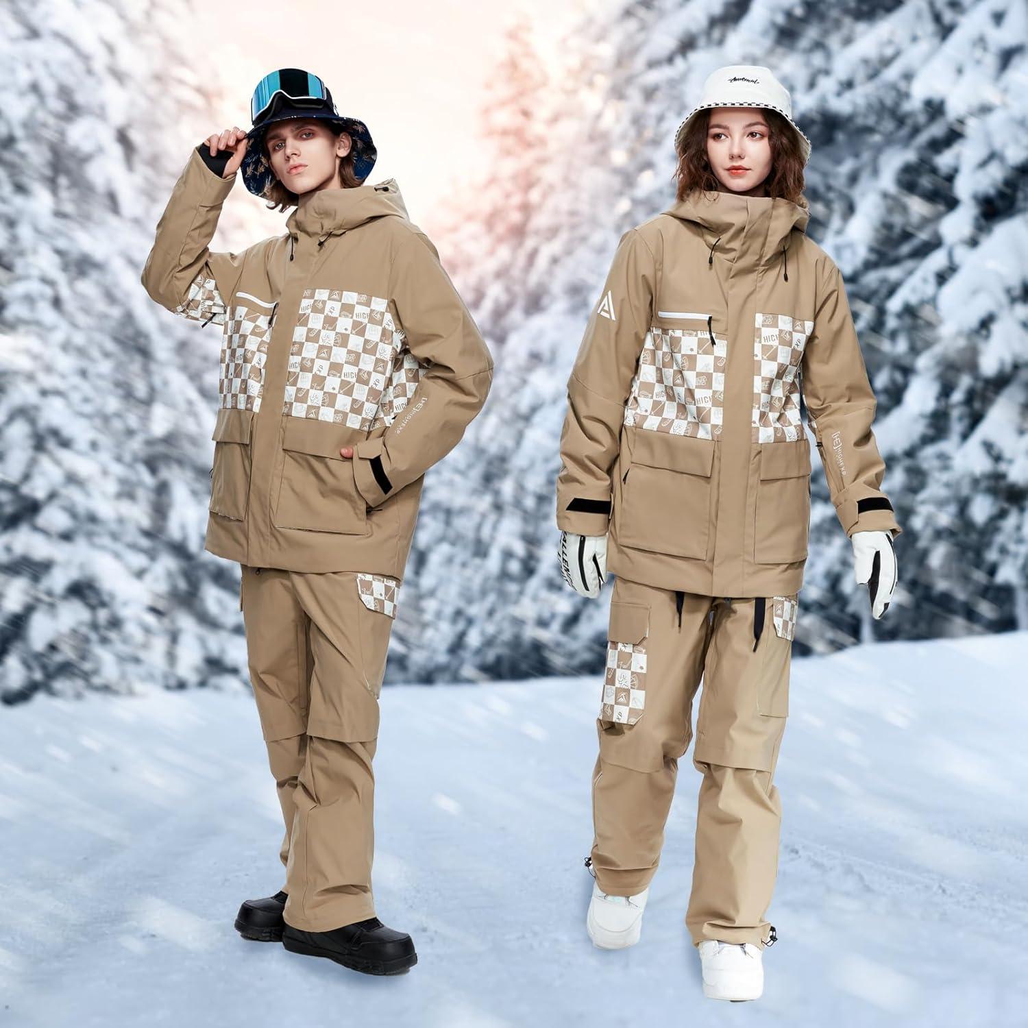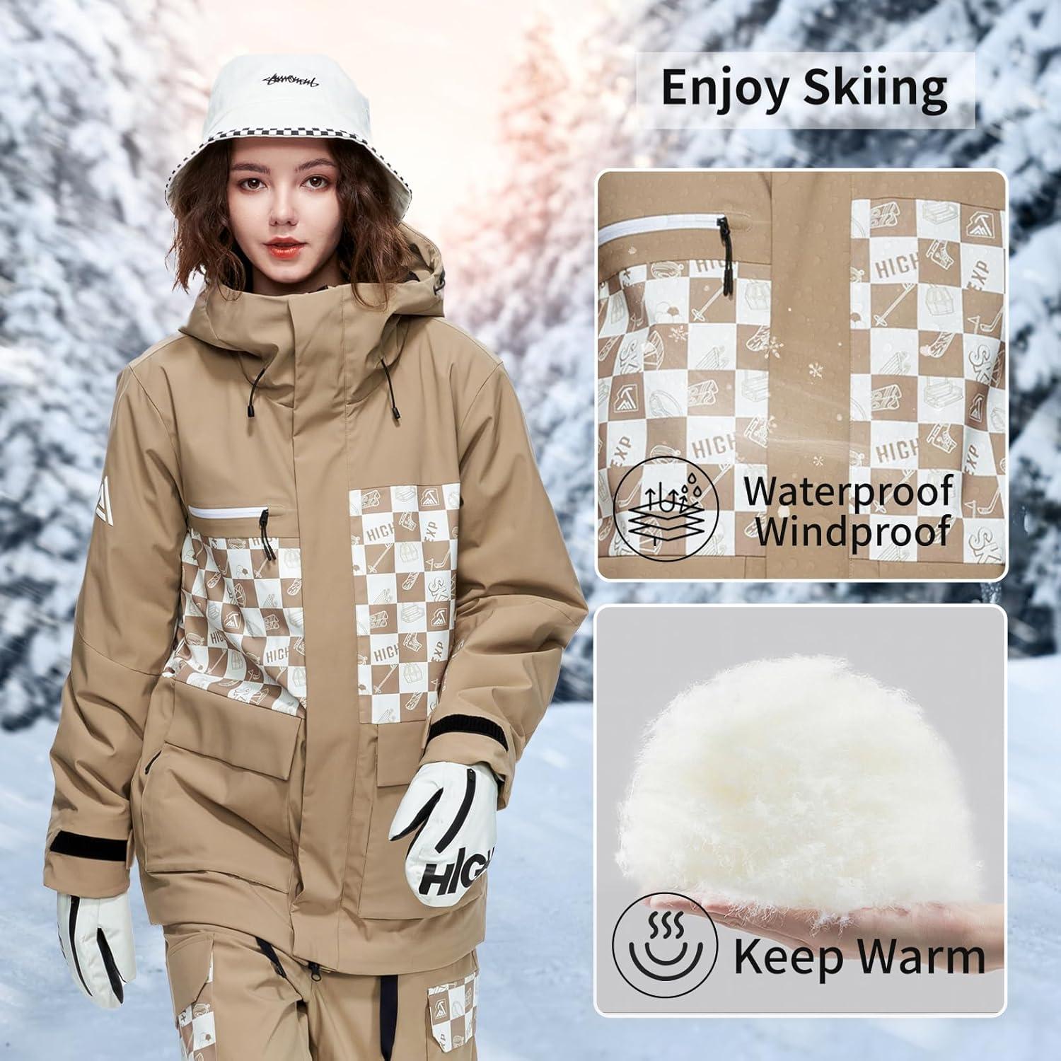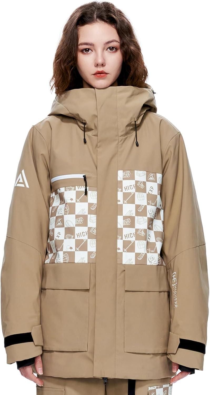 Ski Jacket Snowboard Coat Snow Winter Waterproof Insulated Windproof Baggy Warm Hooded Jacket for Men Women(Khaki and White)