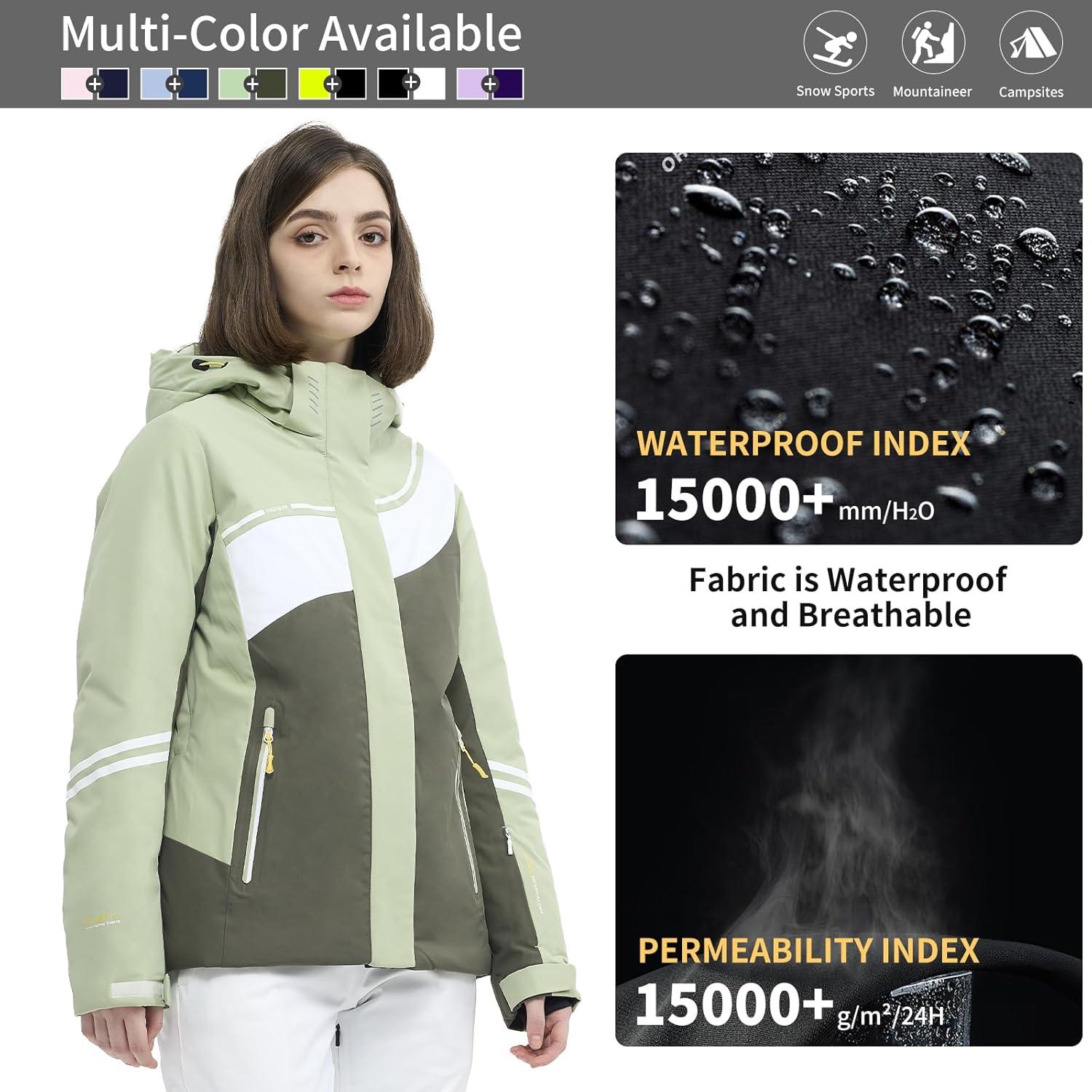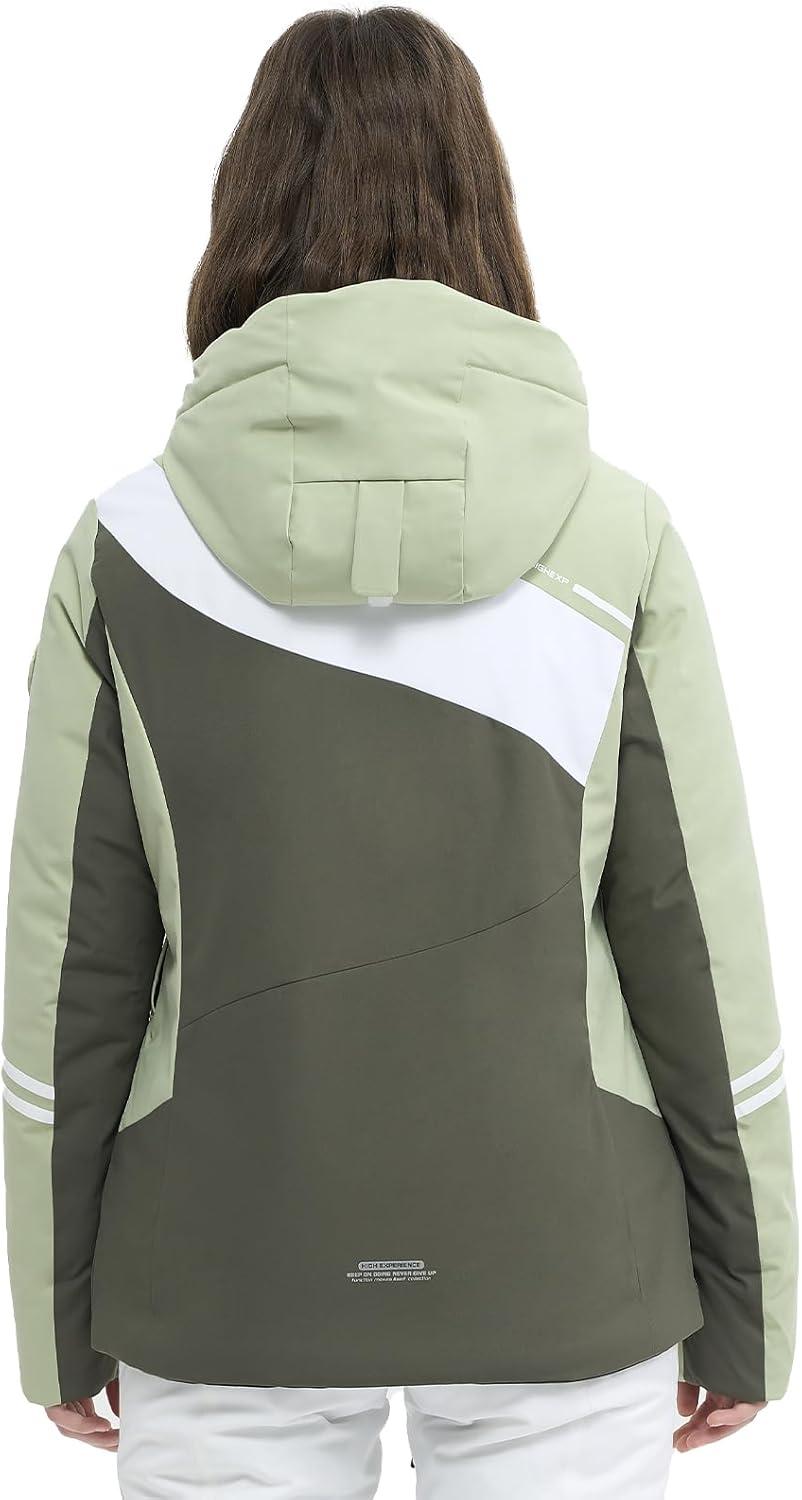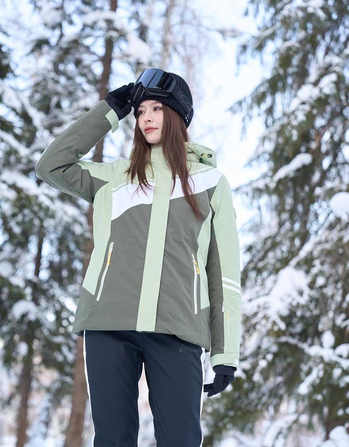 Ski Jacket Women Snowboard Coat Fitted Slim Fit Snow Short Windproof Waterproof Insulated Warm Removable Hood(Light Green-dark Green)