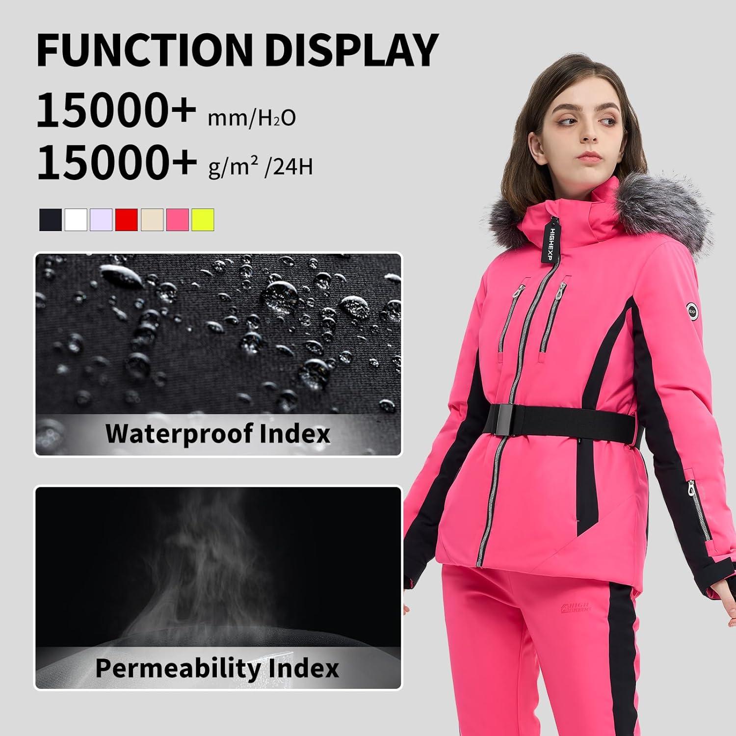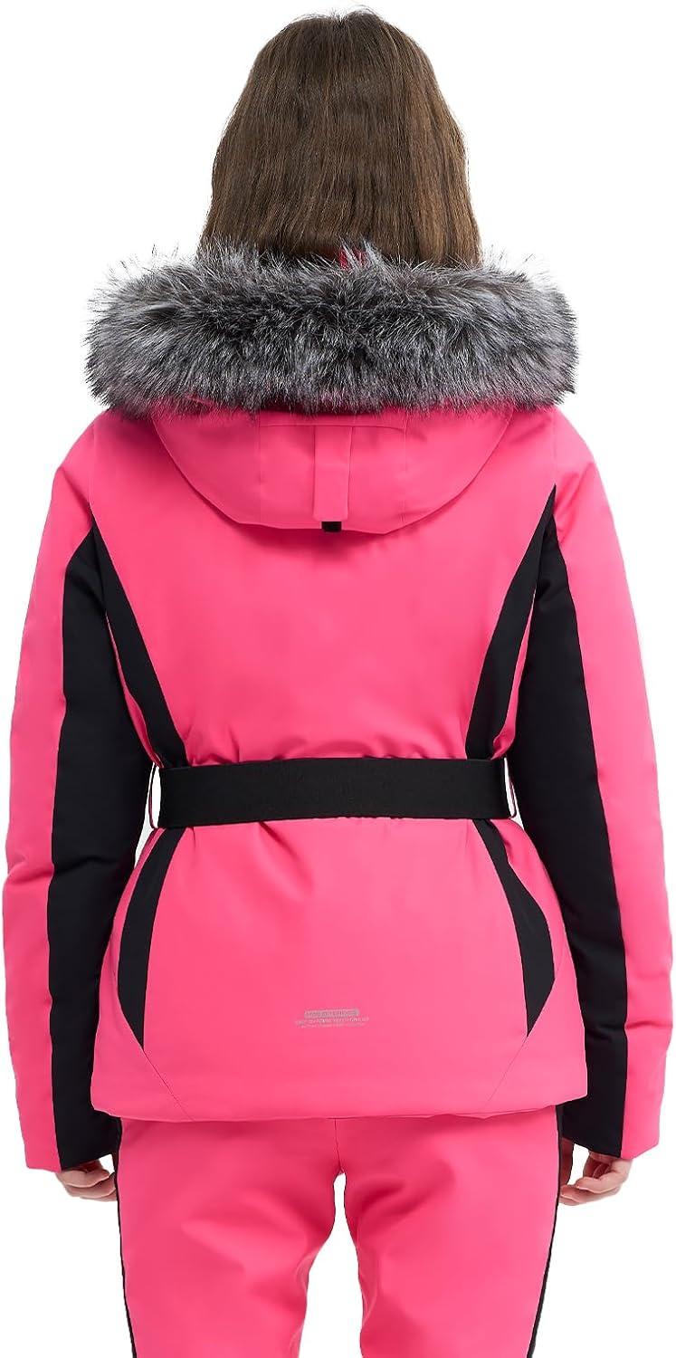 Women Ski Jacket Snowboard Fitted Slim Fit Short Snow Coat Belted Mountain Waterproof Insulated Warm Winter(Hot Pink)