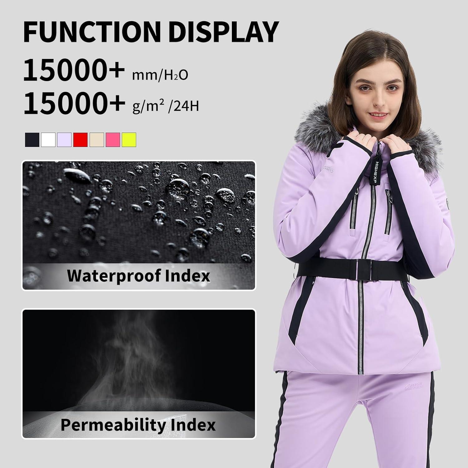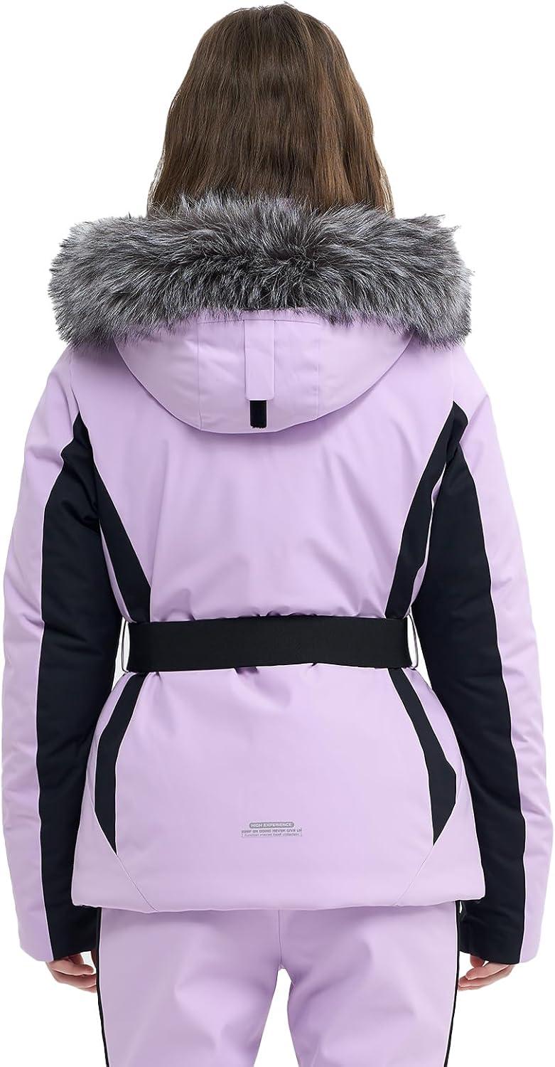 Women Ski Jacket Snowboard Fitted Slim Fit Short Snow Coat Belted Mountain Waterproof Insulated Warm Winter(Light Purple)