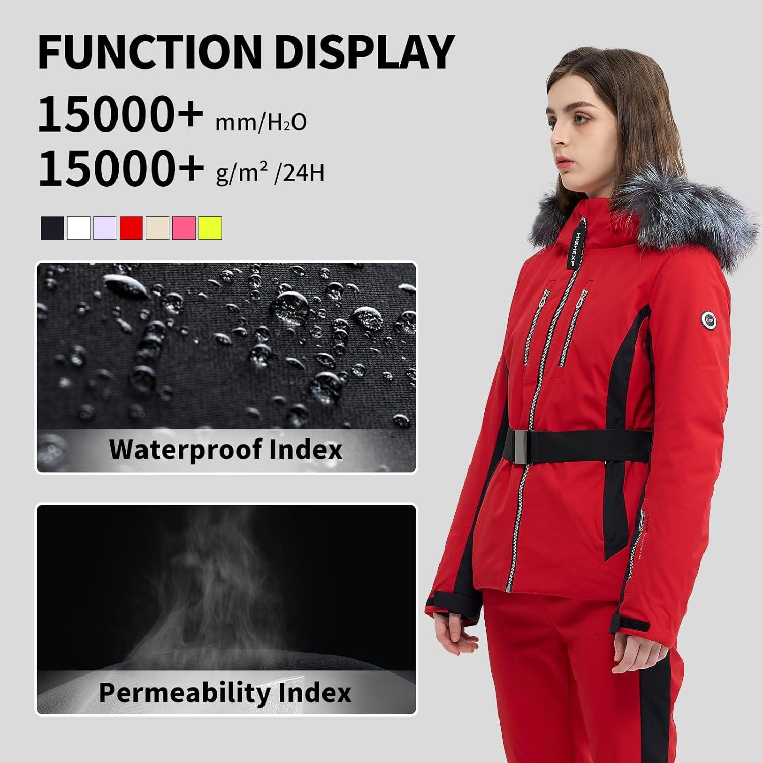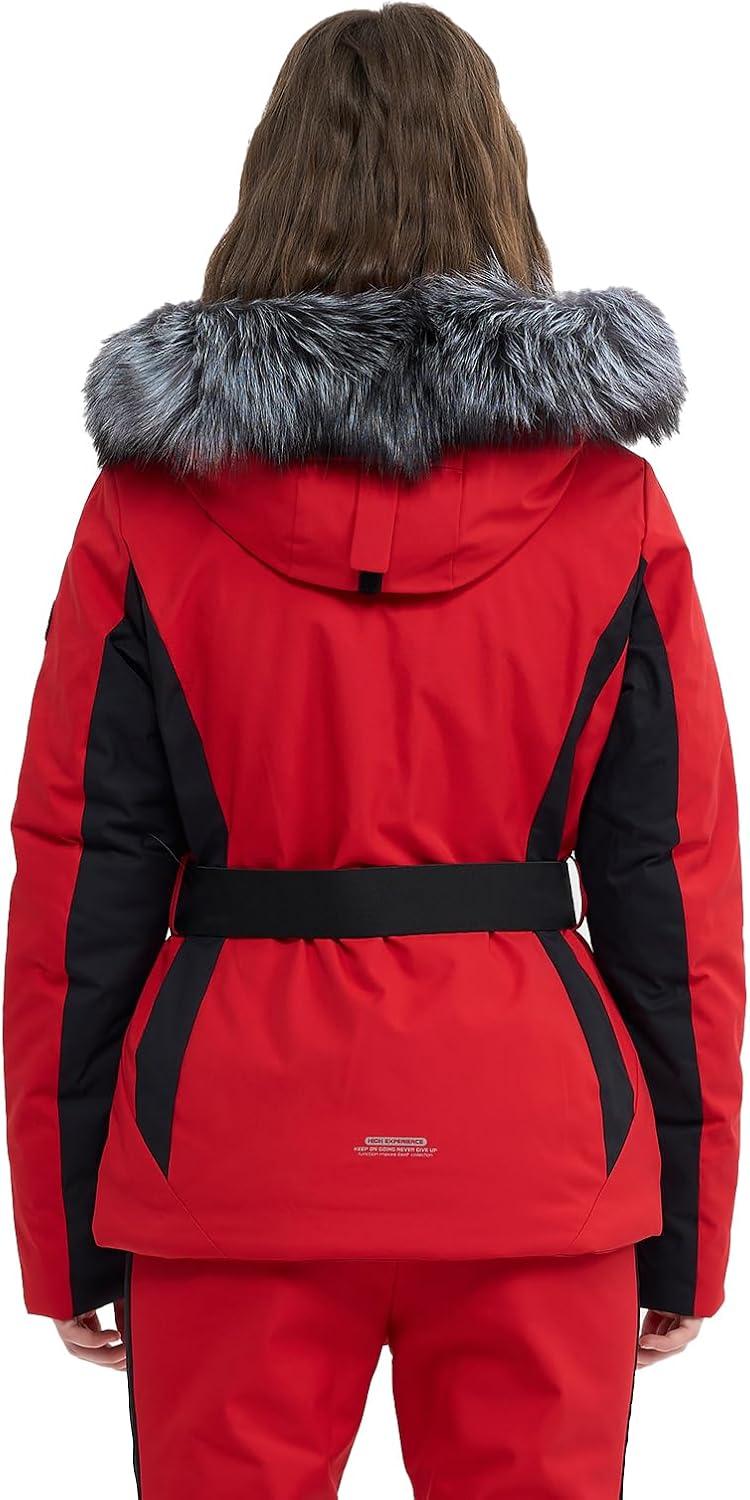 Women Ski Jacket Snowboard Fitted Slim Fit Short Snow Coat Belted Mountain Waterproof Insulated Warm Winter(Red)