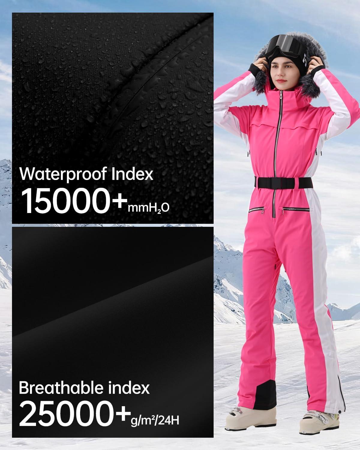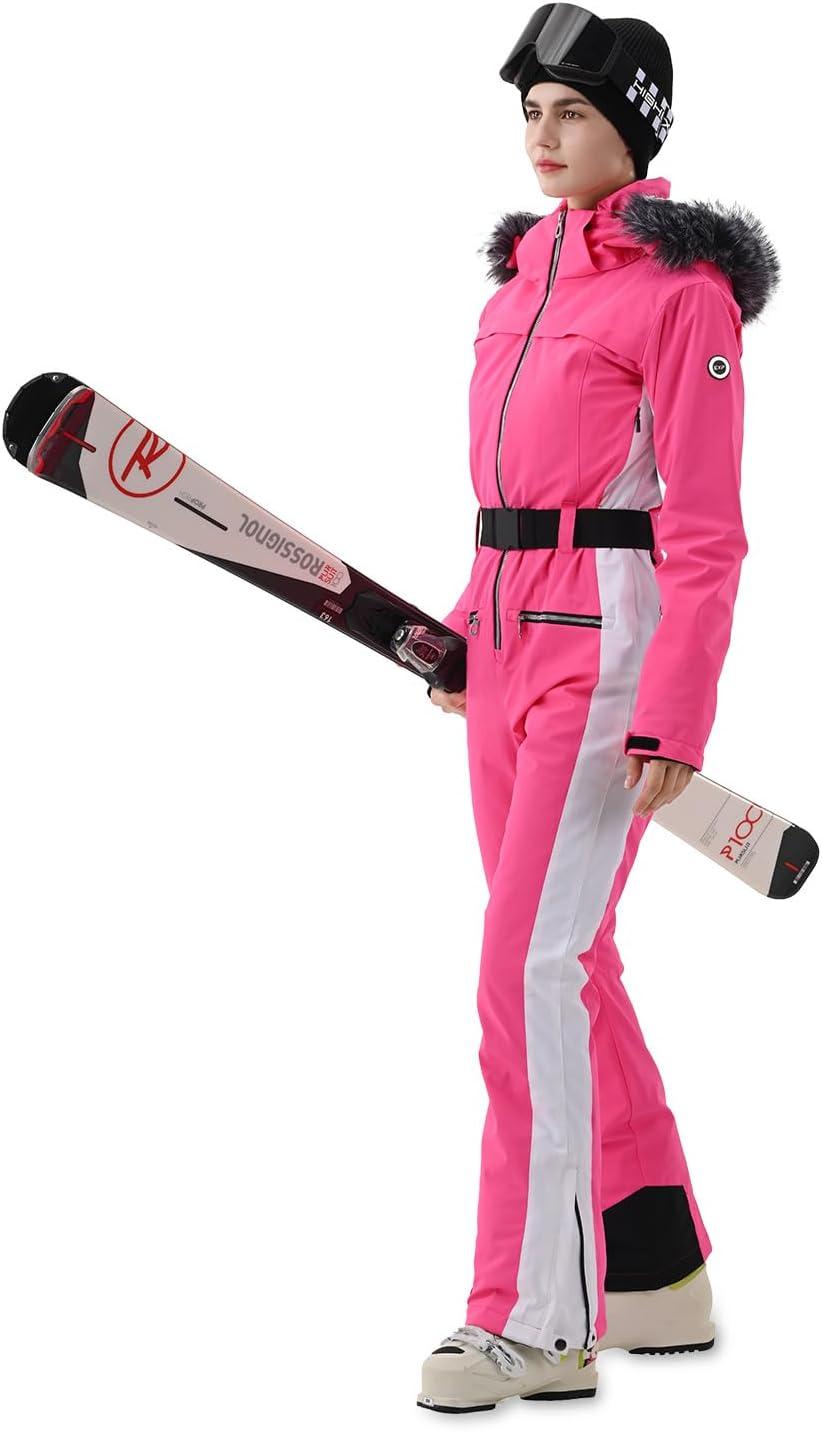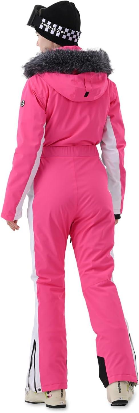 Women Ski Suit One Piece Slim Snowsuit Snow Outfit Snowboard Onesie Waterproof Insulated Winter Warm(Hot Pink White)