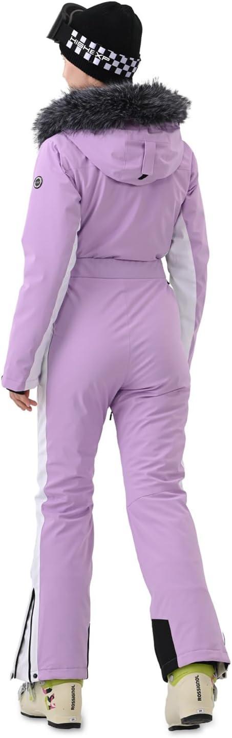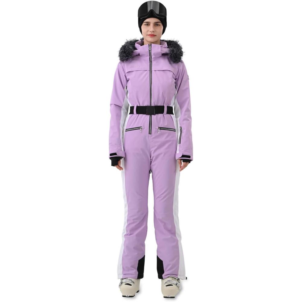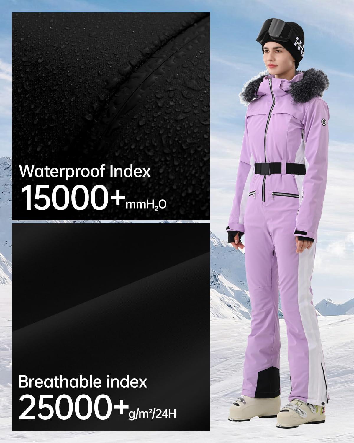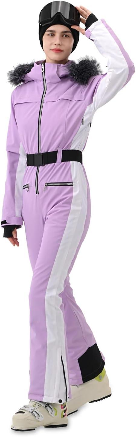 Women Ski Suit One Piece Slim Snowsuit Snow Outfit Snowboard Onesie Waterproof Insulated Winter Warm(Purple White)