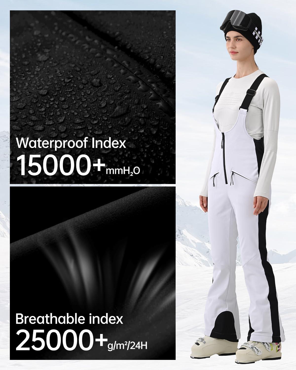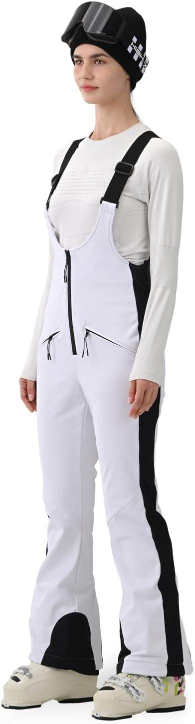 Womens Ski Bib Pants Slim Fit Soft Shell Snow Skinny Fitted Snowboard Insulated Waterproof Windproof Warm(White)